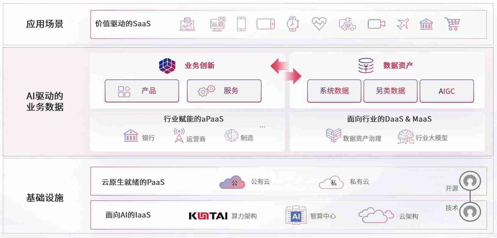数字时代,,,,围绕企业数字化转型的关键要素,,尊龙凯时数码开创性的提出数云融合战略和技术体系框架,,,着力在云原生、、数字原生、、、、AI原生和信创产业上架构产品和服务能力,,,为处在不同数字化转型阶段的快消零售、、、、汽车、、、、金融、、医疗、、政企、、教育、、、运营商等行业客户提供泛在的敏捷IT能力和融合的数据驱动能力,,,,构建跨界融合创新的数字业务场景和新业务模式,,,,助力企业级客户建立面向未来的核心能力和竞争优势,,全面推动社会的数字化、、、、智能化转型升级。。。